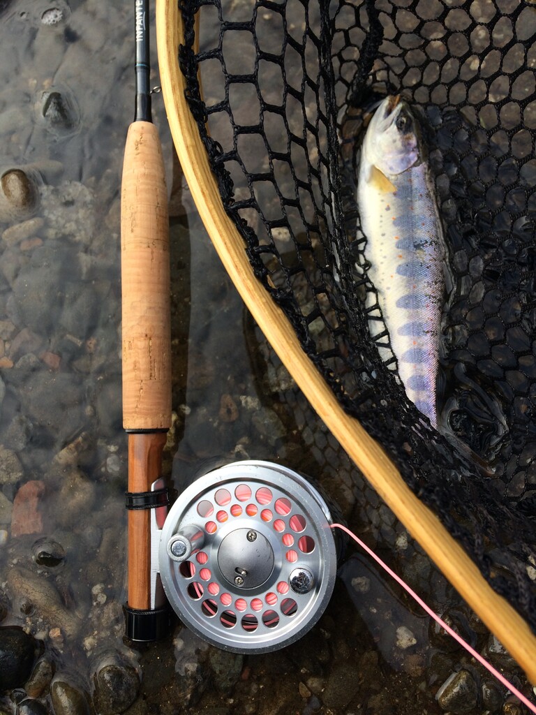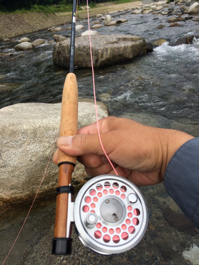ロッドはグレーのティムコインファンテ803-4、リーダーはスミスマリエット6x12フィート、ティペットはアキスコ6x、ラインはヤマメラインDT-3。