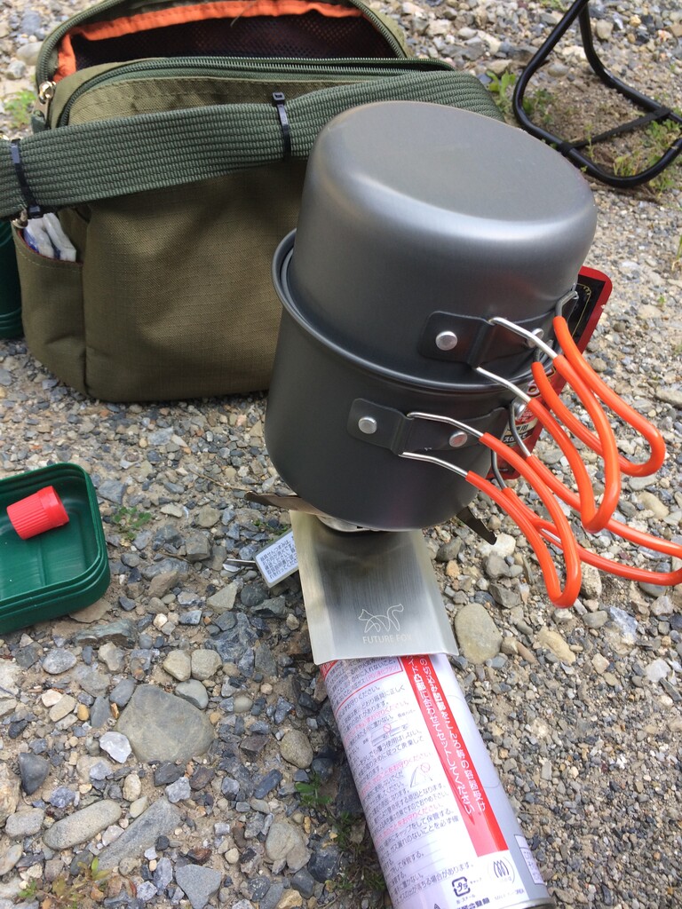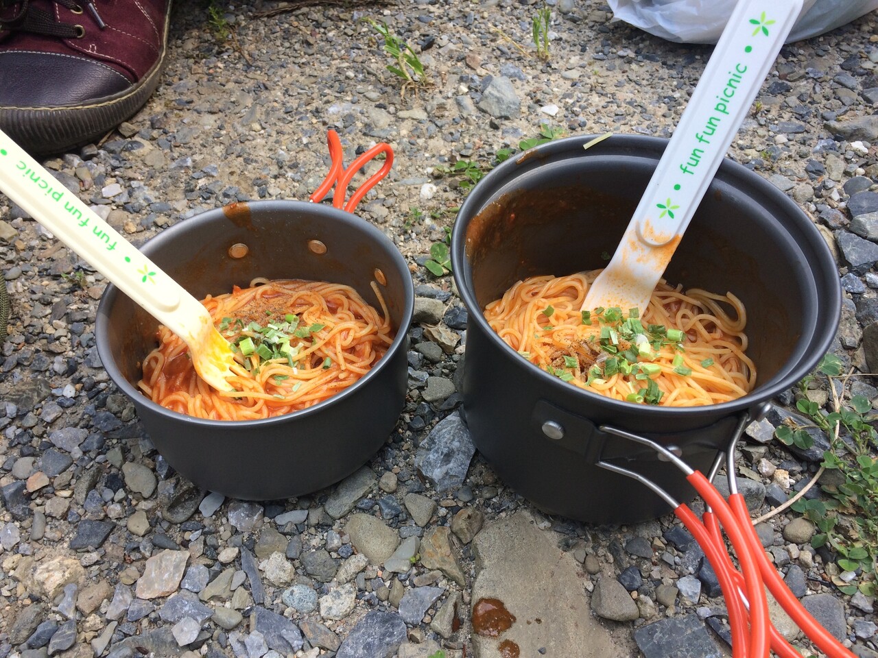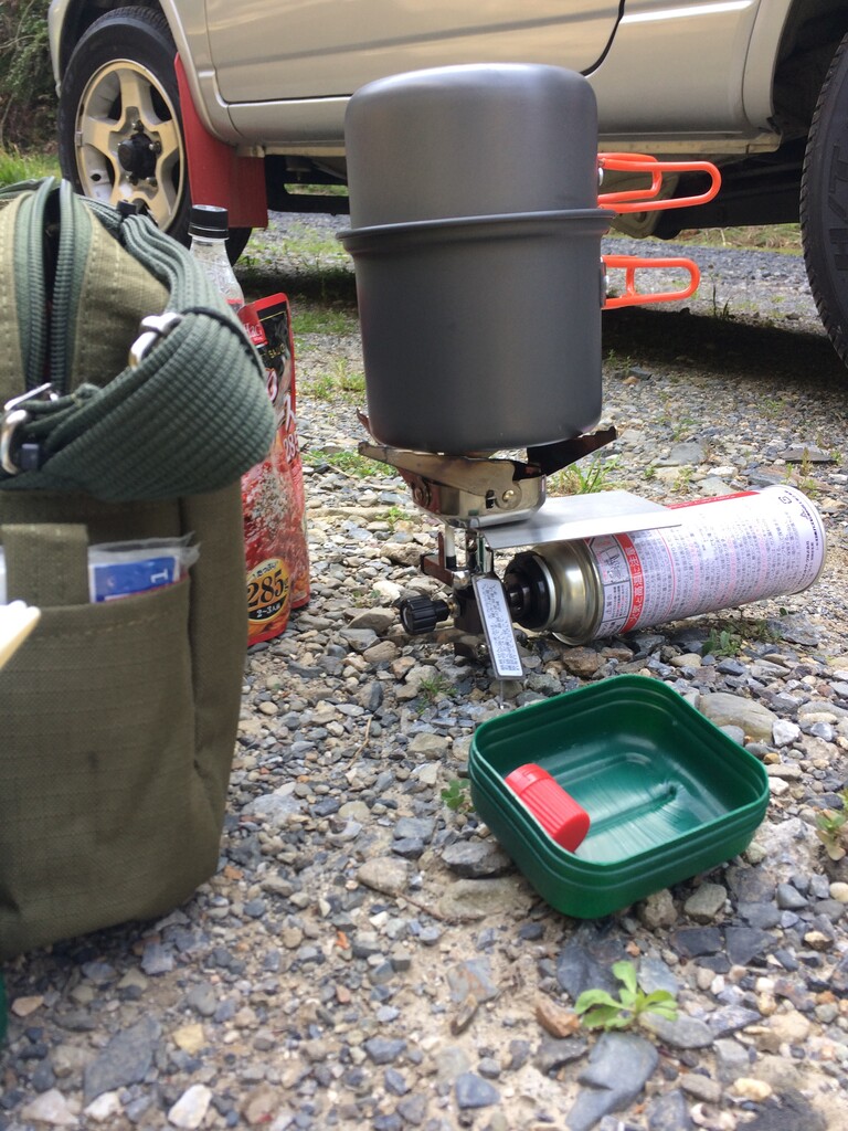 昼飯はカミさんとイワタニバーナーでミートスパを食べてニコニコ。